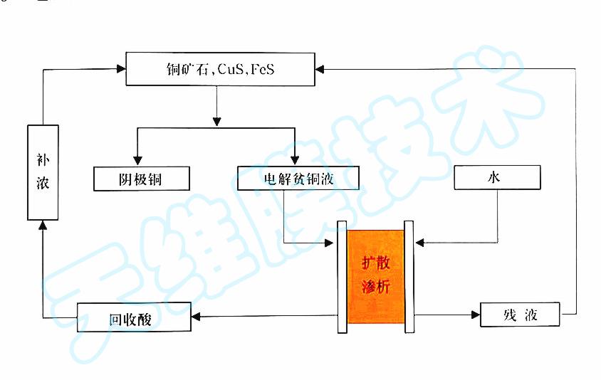 濕法煉銅生產(chǎn)中產(chǎn)生大量的電解貧液,若用石灰中和,除造成酸和銅的損失外,還引發(fā)環(huán)境問題。用陰膜擴散滲析回收電解貧液中的廢酸再返回系統(tǒng)使用,這樣既為企業(yè)節(jié)約了資源,又解決了環(huán)境污染問題。
