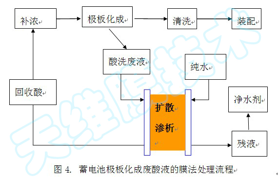 極板化成之后的廢酸由于酸洗極板之后廢酸中鐵離子含量增加。如果重復(fù)使用由于鐵離子的存在會(huì)與負(fù)電極形成腐蝕微電池,引起負(fù)極金屬溶解;電解液廢酸中鐵離子含量高則引起電池的自放電使電池容量減少,降低電池使用壽命。用擴(kuò)散滲析法回收處理電解液廢酸和化成廢酸,鐵離子截留率在90%以上。